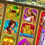 Paytable. In the center is a stone screen with symbols of the category High. There is a blue cross in the upper right corner. Paytable header in red. Bonus – 3 or more bonus symbols anywhere on an active payline activate the bonus game. Wild – replaces any other symbol on the reel, except for Scatter and Bonus. Scatter – At least 3 Scatter symbols anywhere on the reel trigger a free spin round. Two symbols of the middle category – brown and white triremes with the number of appearing on the reel and the amount of payments. Below are the page numbers of the table.