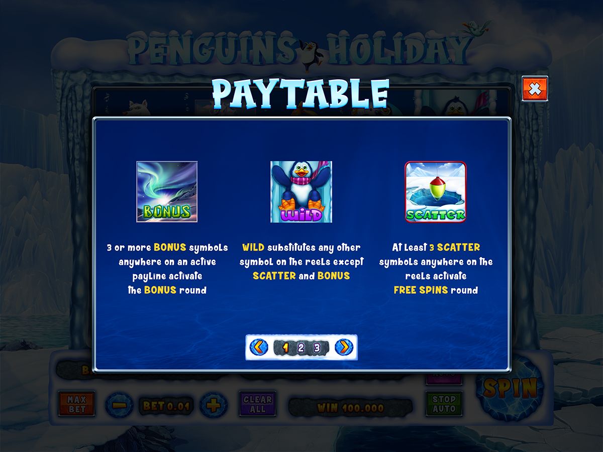 The paytable reveals the treasures hidden in the Arctic reels. This graphic details the value of each symbol, from the fish to the igloos, and explains how to trigger the Wild, Scatter, and Bonus features. It’s the penguins’ guide to navigating their frosty holiday adventure.