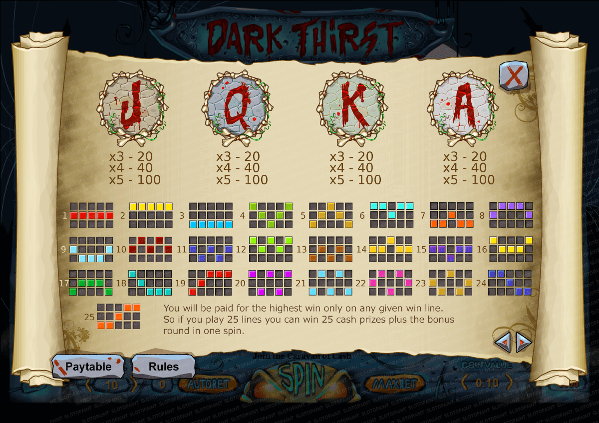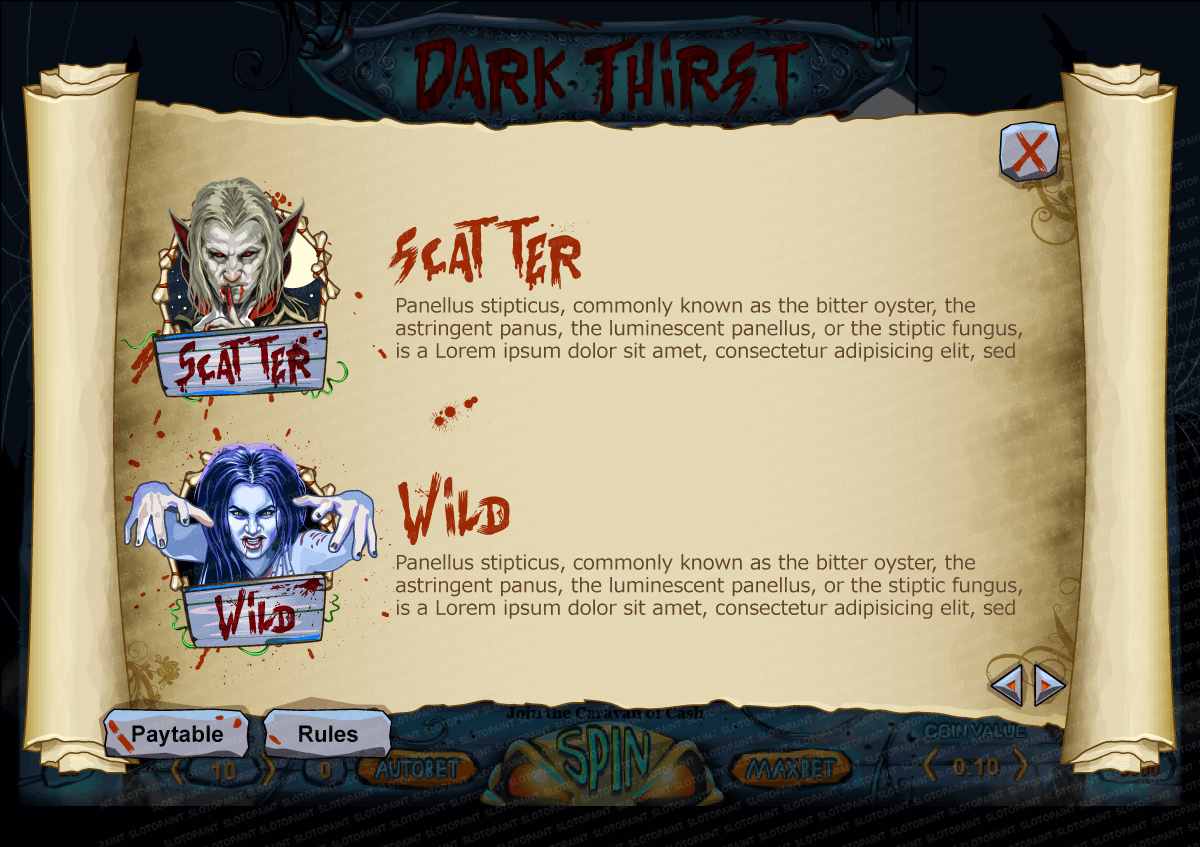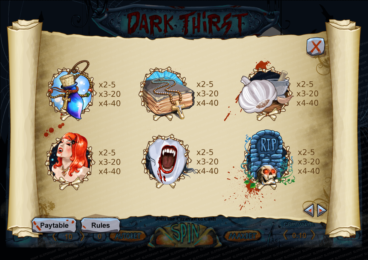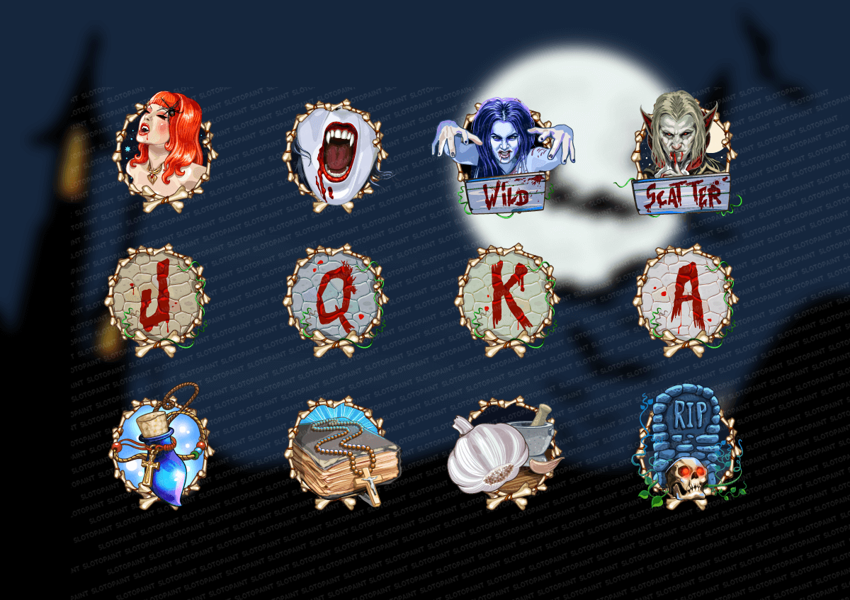 For our frequent guests we have prepared an excellent surprise! We suggest you to make a profitable acquisition in the form of a set of graphic materials and illustrations, specially designed for the vampire slot machine “Dark Thirst”. In this set, which is made in vector style, you can find a unique thematic logo, the main background image, a set of themed game symbols, as well as the game interface and much more. Become the legal owner of this kit today and take part in thematic promotions and bonus games. For detailed information, tables of rules and payments are provided.