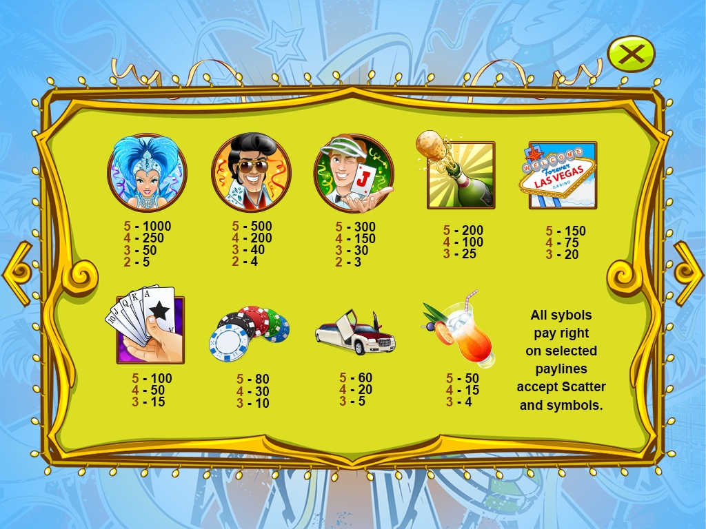 Are you always dreamed to visit the most prestigious casinos in Las Vegas, come off on the full and spend the won money to the fullest? Now you have the chance to realize your dreams with our game slot machine “Vegas Riches”. You will be a witness of a luxurious life, where the money flows like sparkling champagne and dealers shout your winning combinations.