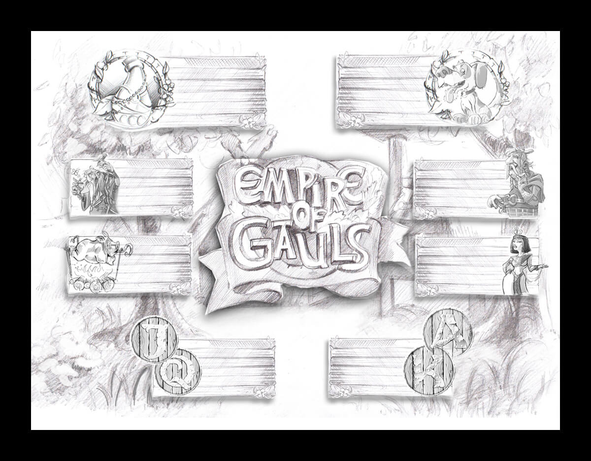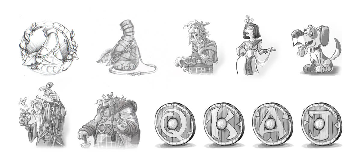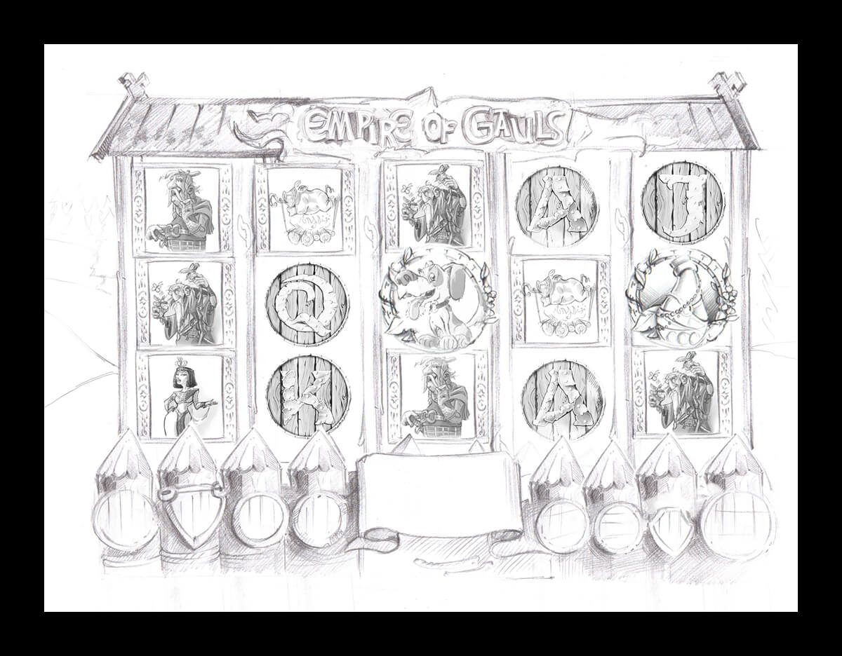 Preliminary sketch version of game reels, UI and game symbols.
